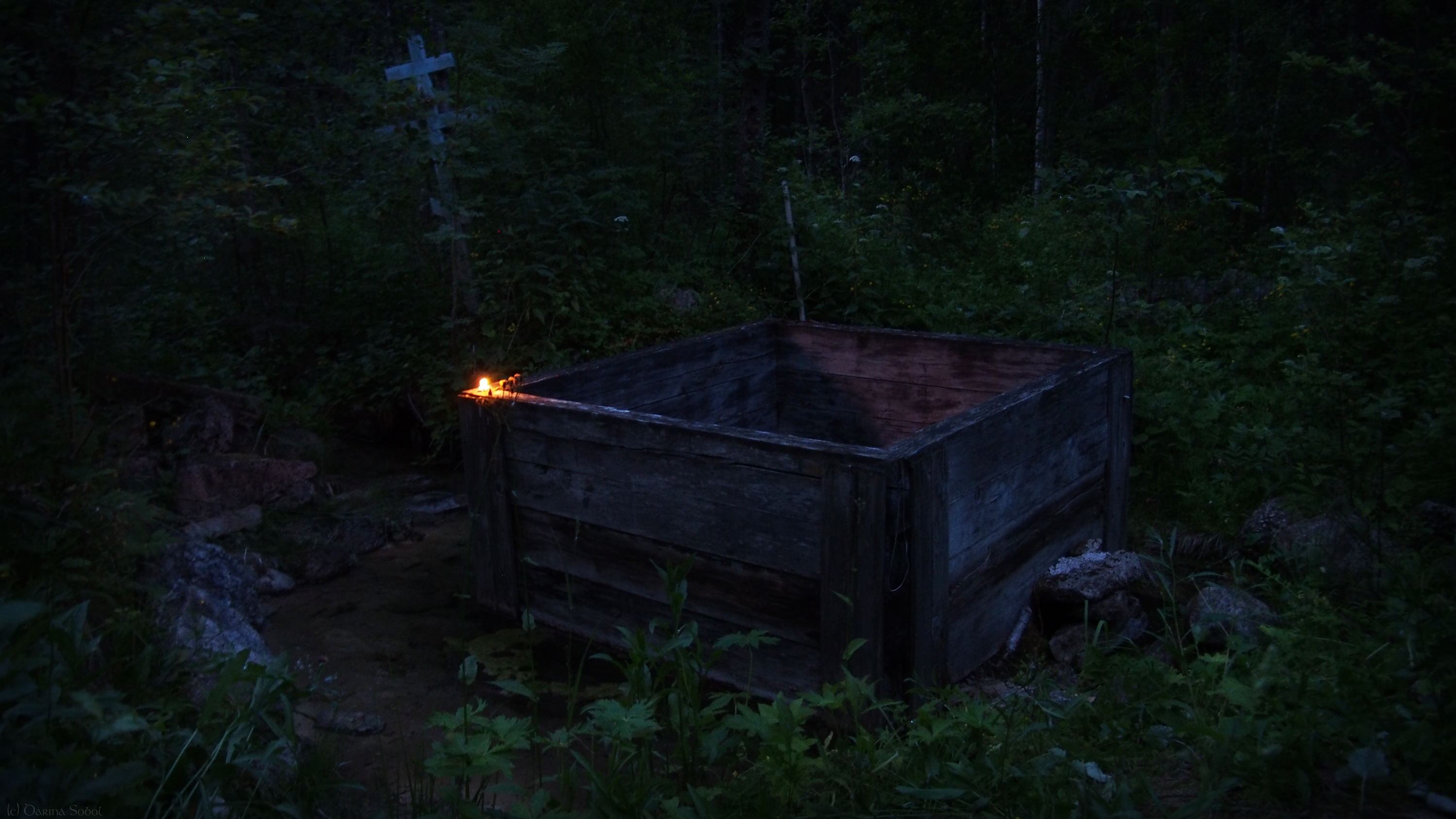 На фотографии запечатлен священный источник, находящийся в лесу вблизи деревни Каложицы. Сейчас он практически заброшен, а дорога к нему заросла травой в человеческий рост.