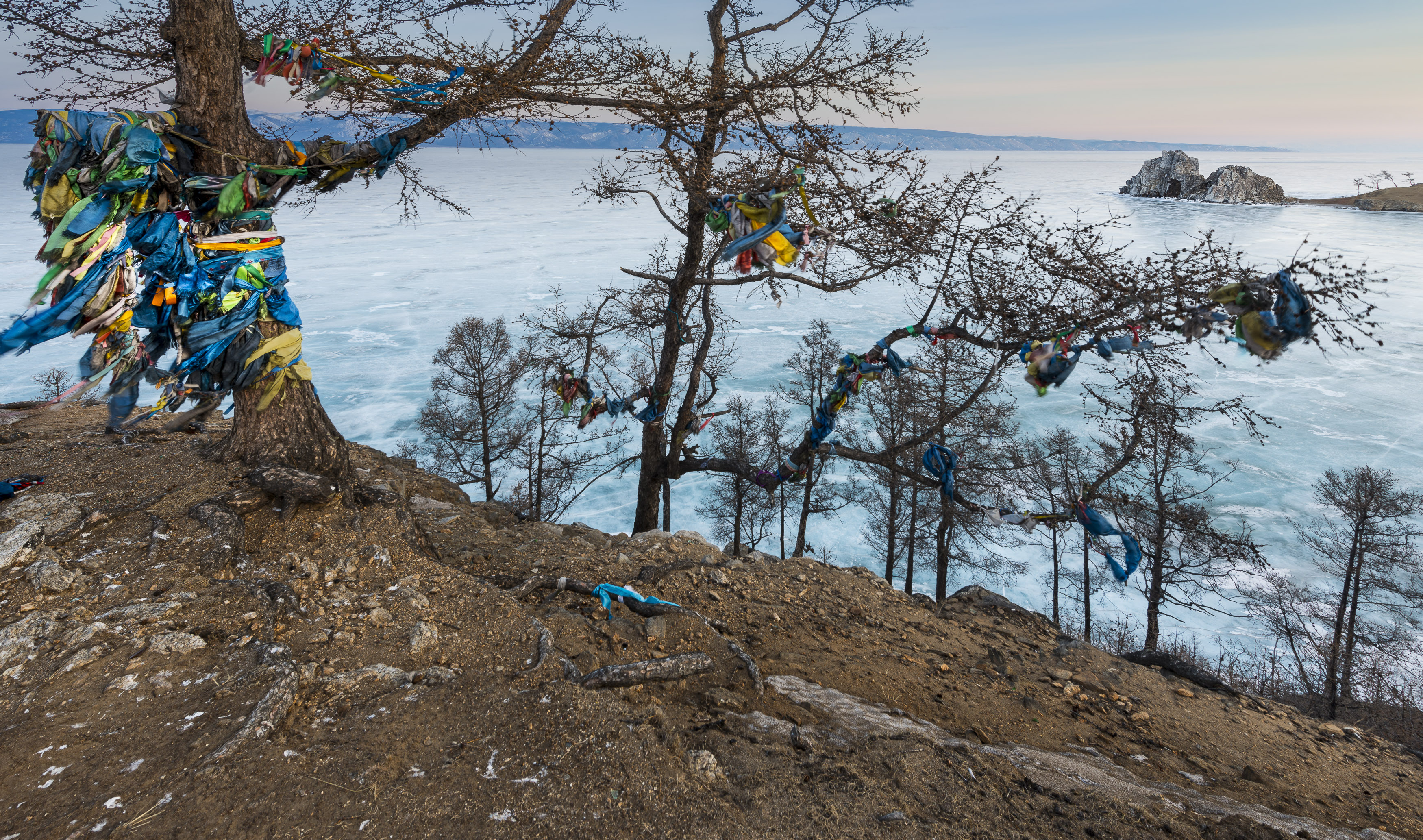Colorful offerings wrap the Tree of Desires near Cape Burkhan or Shamanka Rock on Olkhon island, Lake Baikal, Siberia, Russia. According to an ancient shamanic legend, 13 north Noyons, sons of divine gods called Tengris, came down from heaven to judge over people and chose a place on the Earth to stay. The oldest and the strongest of them, Han Khute-baabay chose to live in the cave of Shamanka rock. The place was considered so sacred that even visiting noblemen dismounted their horses and walked by the cave not to disturb. Even today, shamanism is part of life of the Buryat people living around the Baikal. According to their belief everything has a deity living in it, and people treat sacred places (marked or not) with great respect. Drivers slow down to flick out coins, others tie colorful textiles with prayers and names on them to bushes and trees and sometimes poles erected for this cause. Shamans help with everyday matters as well as with those of the spiritual world. I was travelling in to Lake Baikal from Hungary in 2016 to visit this magical place in March while the lake is still frozen.