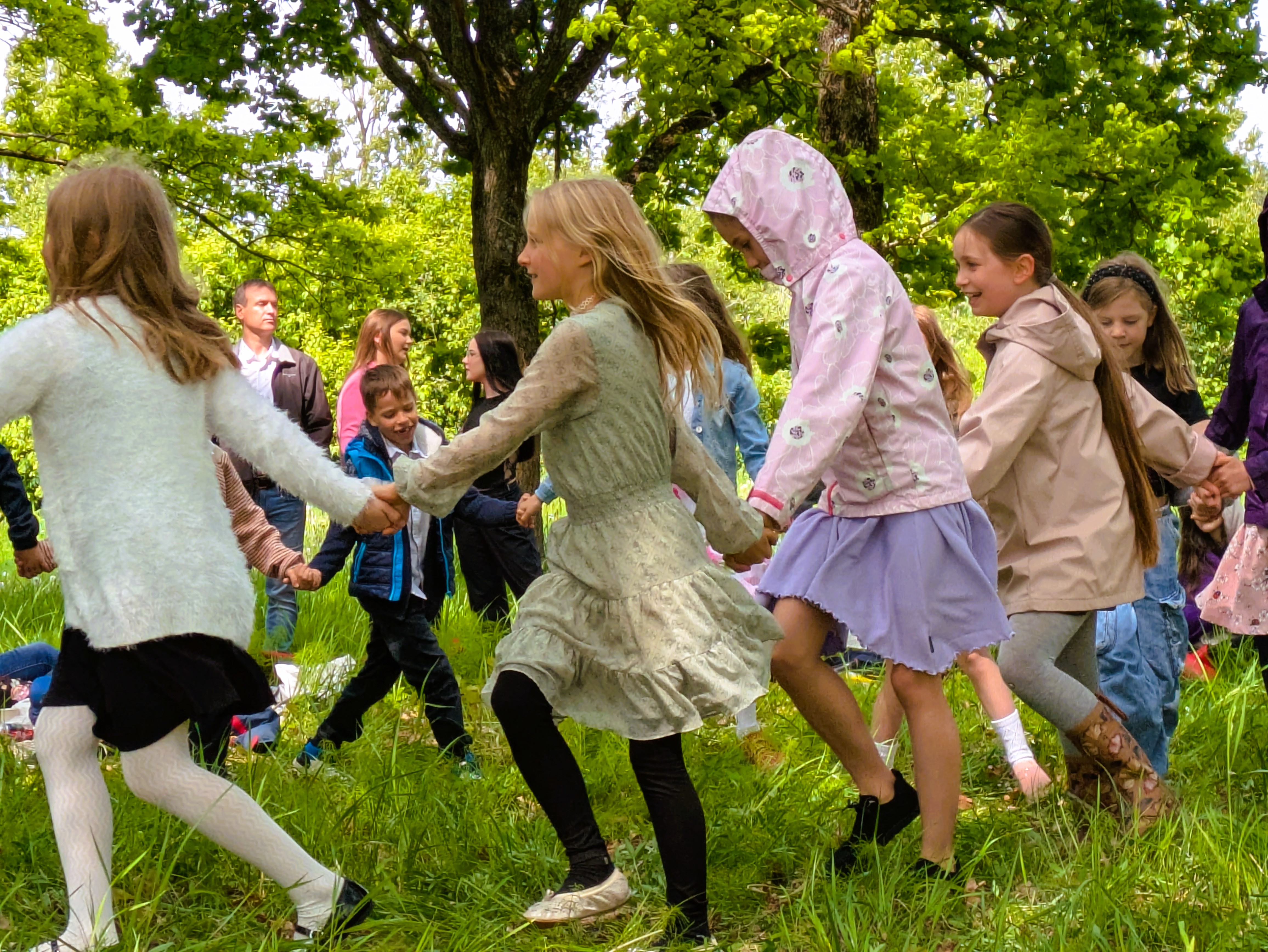Foto on pildistatud koolipere rõõmsal kooliaasta ühisel lõpupeol Iru hiies 13. juunil. Suvine pidu haaras nii väikesed, kui suured tantsima, laulma ning tõi palju rõõmu. Mängiti pilli, söödi head paremat, mängiti pärimuskultuuri laulumänge. Üheskoos tunti tänulikkust esivanemate ja pühapaiga vastu. Koos tantsimine tõi palju lusti, kogeti pühadust kõige elava suhtes. Lastevanematel paluti hiiekommete kohaselt tulla hiide rõõmsa südamega ja võtta kaasa ühisele lauale häid palasid ning tuua väike and hiie jaoks. Eelnevalt tutvustati hiiekombeid ja räägiti lastele üldiselt hiitest. Nii jätsid inimesed autod eemale ja meie peopaigani juhatasid looduslikest paeltest ehted ja kaunsitused. Inimesed käitusid hiie suhtes austavalt ja lugupidavalt. Peol oli alguses sügav rahu, kuid ühel hetkel haaras suur rõõm- inimesed tantsule ja laulule. Osad käisid ka jõe juures oma hõbedast sõlega vanade traditsioonide sarnaselt, et sissepoole vaadata, sirutuda hinges ülespoole ning meie memmede, taatide sarnaselt veidi hõbedat vette kraapida. Kes ise soovisid võisid ka rahvale eraldi esineda laulda, mõnda pärimuskultuuri pilli tutvustada, mängida või seltskonnale tantsu, mängu õpetada. Tantslust hiies toob naeru näole.