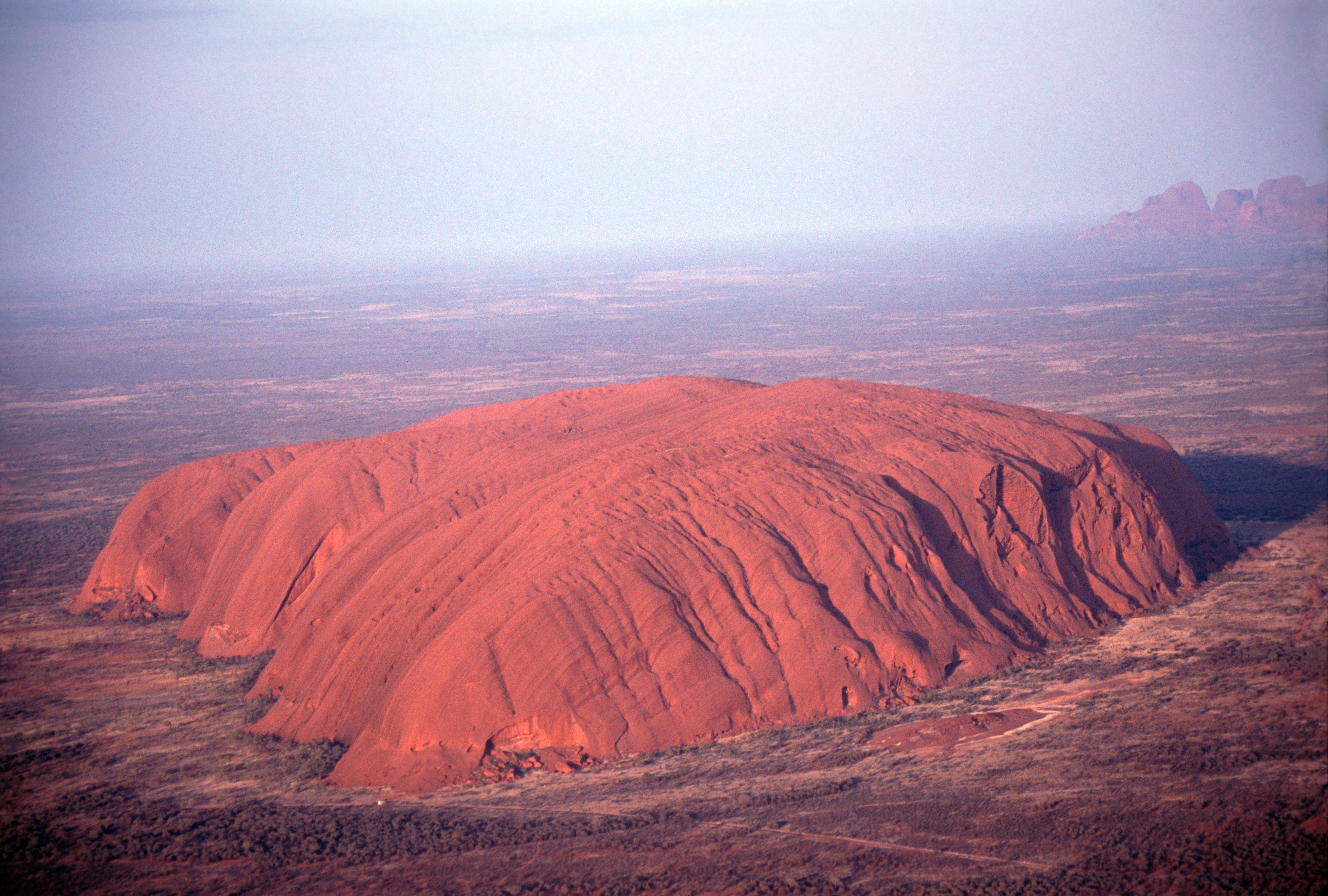 Located in the center of Australia, the massive rock formations of Uluru (Ayers Rock) and Kata Tjuta (the Olgas) are the most prominent and well known sacred sites of the Aboriginal people. Rising 346 meters high, with a circumference of 9.4 kilometers and covering an area of 3.33 square kilometers, Uluru is the single largest rock outcropping all of Australia. Uluru is often referred to as a monolith, and for many years was listed in record books as the world’s largest monolith. That description, however, is inaccurate, as Uluru is part of a much larger underground rock formation which includes Kata Tjuta. The world’s largest monolith is actually Burringurrah (Mt Augustus) in Western Australia, which is more than 2.5 times the size of Uluru, stands 858 metres above the ground and covers and area of 48 square kilometers. In various tourist guidebooks it is said that 2/3 of Ayers Rock is beneath the surrounding land but this is not the case according to the science of geology, which explains that Uluru is only the exposed tip of a much greater mass of rock extending far below the surrounding plain as an integral part of the earth’s crust. Separated from one another by approximately 50 kilometers, Uluru and Kata Tjuta are situated along a straight line passing onto another holy peak known as Mount Conner. Geologists disagree about the origins of Uluru and Kata Tjuta. The most widely held theory is that both rocks are the remnants of a vast sedimentary bed laid down some 600 million years ago. Over eons of time the bed was raised and folded by movements of the earth’s crust, formed into a mountain range, and then slowly eroded leaving the towering rocks behind. The sandstone rock of Uluru is actually gray but is covered with a distinctive red iron oxide coating, while the thirty-six domes of Kata Tjuta are a harder type of granite composed of quartz and feldspar. The origins of the cave-like depressions on both outcroppings, especially those of Uluru, are the subject of debate among geologists but the most commonly held view is that the rock surfaces had been partly eroded and enlarged to form the depressions. The beginning of Aboriginal settlement in the Uluru region has not been determined, but archaeological findings to the east and west indicate a date more than 10,000 years ago, though some scholars estimate that human settlement in the region may actually date to 22,000 years ago. According to Aboriginal myths, Uluru and Kata Tjuta provide physical evidence of feats performed during the Dreamtime creation period. The aboriginal tribe of Anangu are the direct descendants of these beings and are responsible for the protection and appropriate management of these ancestral lands. The knowledge necessary to fulfill these responsibilities has been passed down from generation to generation. To the Pitjantjatjara, Yankunytjatjara and Anangu tribes Uluru represents the living core of their belief. No other place in Australia is so rich in mythology, song-lines and stories, or so associated with events from the Alcheringa or Dreaming. In the language of the local Aborigines. ‘Uluru' is simply a local family name that is applied to both the rock and the waterhole on top of the rock. The thirty-six rounded rocks of Kata Tjuta (meaning ‘Many Headed Mountain’), are located in the same National Park as Uluru and the tallest rock, Mt. Olga at 546 meters is about 200 meters higher than Uluru. Kata Tjuta is much less visited by tourists that Uluru and therefore has a more peaceful feeling. By Aboriginal tradition only certain elderly males may climb the rock but despite this tradition the Australian government allows tourists to make the climb using a metal chain installed in 1964. Over the years there have been at least forty deaths, mainly due to heart failure while climbing Uluru, and several people have plumetted to their death while climbing. The Anangu tribe also request that visitors do not photograph certain sections of Uluru, mostly gender-related sacred places, for reasons related to traditional beliefs. This photographic ban is intended to prevent Anangu Aborigines from inadvertently violating this taboo by encountering photographs of the forbidden sites. The first sighting of Kata Tjuta by a European was in July of 1872, when Ernest Giles was exploring the country some 100 kilometers to the northeast. Giles progress towards Kata Tjuta was barred by a large lake. He later named the lake and the Kata Tjuta rocks after the then King and Queen of Spain: Amadeus and Olga. Giles returned to explore the area again in 1873 but was beaten to Uluru by William Gosse who sighted the monolith on July 19 and named it after the Chief Secretary of South Australia, Sir Henry Ayers. Giles also was the first European to climb the rock which he did accompanied by an Afghan camel driver. The inhospitable nature of the terrain ensured that few whites were to venture into the region. Farmers were defeated by the lack of water and the only whites to pass through the area were trappers, miners and the occasional missionary. The area was declared an Aboriginal Reserve in 1920 and this existed until the 1940s when road access, the possibility of gold in the area, and the tourist potential of Uluru, showed how fragile the original reserve had been. Ayers Rock was created a national park in 1950 and in 1958 was combined with the Olgas to form the Ayers Rock National Park. In 1959 a motel lease was granted near the rock and soon after an airstrip was built. By the 1970s, Ayers Rock and Mount Olga had become the most famous stop on the outback tourist circuit. In 1976 the Commonwealth Government set up the lease at Yulara (a resort complex and service village located 20 km from the base of Uluru) and in 1983 the old tourist facilities near the rock were closed down. In 1985 the title to Uluru-Kata Tjuta National Park was returned to the local Pitjantjatjara Aborigines who, in turn, granted the Australian Na