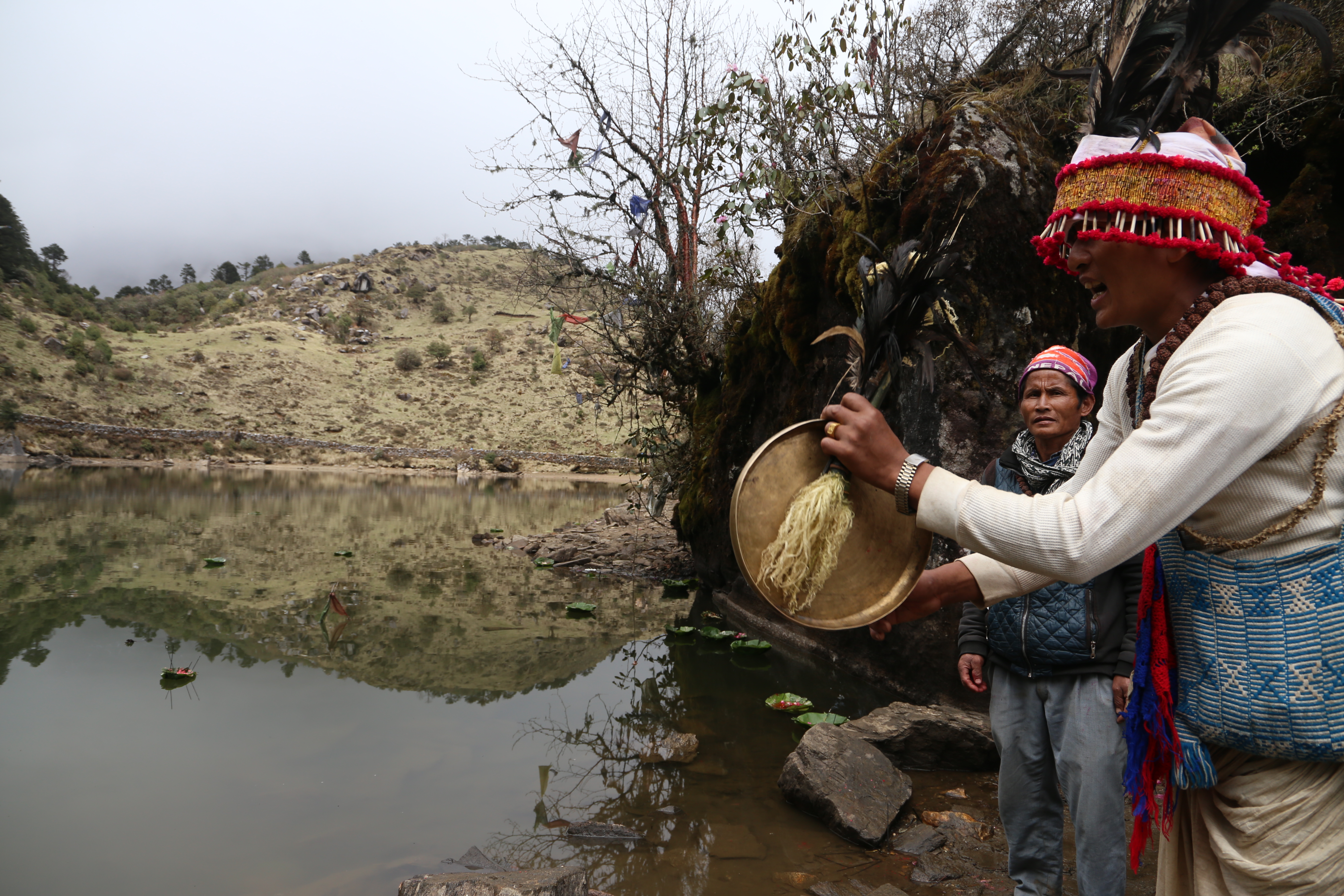Среди народов Восточного Непала - в первую очередь, рай и лимбу - распространена религия кирати (или мундум, по названию священного писания). Жрецы-шаманы кирати благословляют и лечат, а также возглавляют паломничества к обиталищам сильнейших духов. Одно из таких мест - озеро Сальпа, служащее приютом горному духу. Раз в год, на майское полнолуние, десятки шаманов и тысячи паломников поднимаются на высоту 3500 м над у.м., чтобы поклониться священному месту. Некоторые пилигримы приезжают из самого Катманду - а это более 24 ч. автобусом, плюс 3-4 дня на само восхождение. На фотографии - жрец кирати камлает на берегу озера Сальпа.