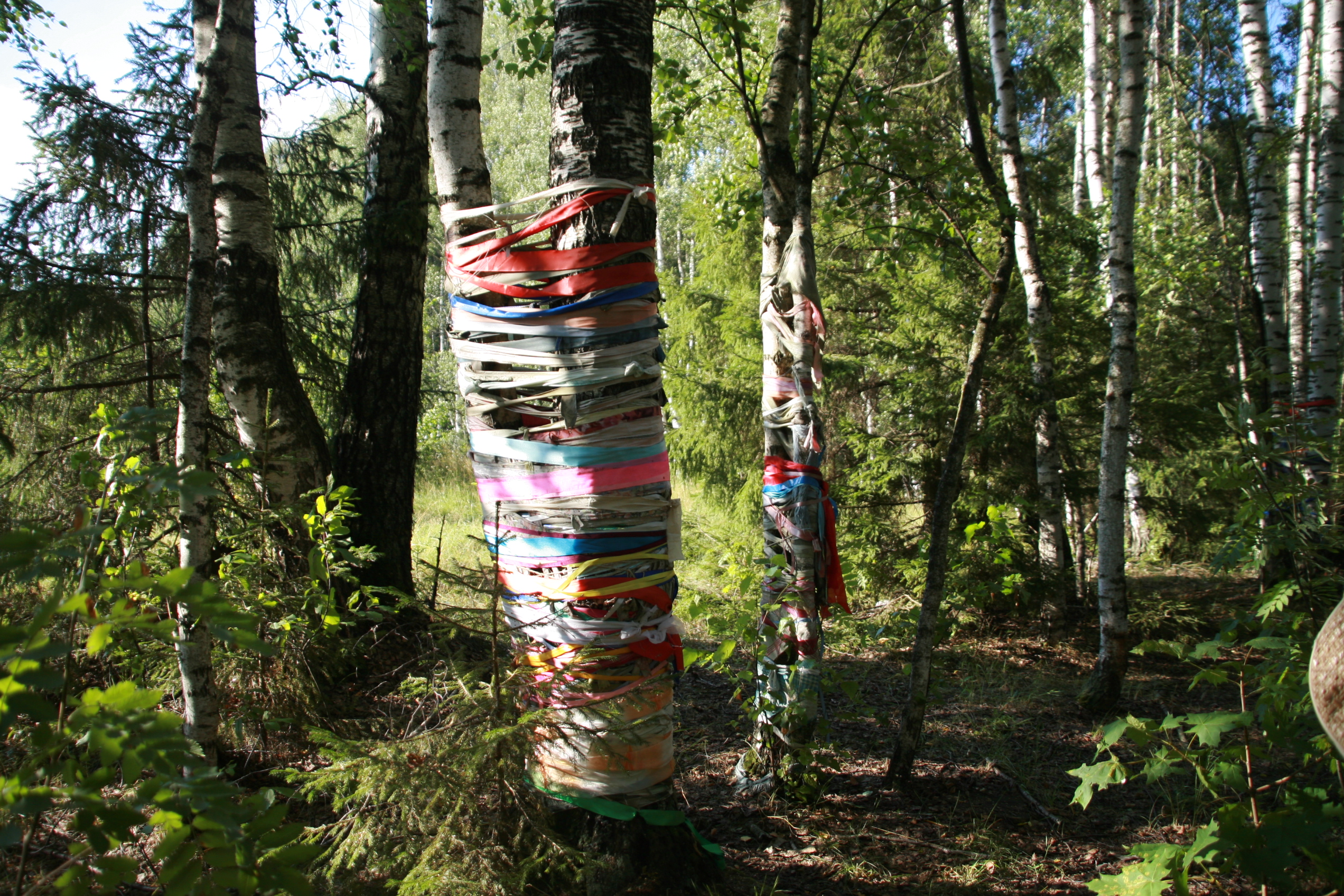На фотографии запечатлены две березы, опоясанные лентами. Одинокие девушки, парни и вдовы молятся у этих деревьев, растущих рядом, в поисках пары или в желании завести детей. Эти березы являются частью сакрального комплекса для проведения окказиональных обрядов Считается, что для исцеления больного человека от болезни необходимо повесить на специально сооруженную перекладину что-либо из его одежды, поставить свечку и обратиться к божеству с жертвой: уткой или гусем, караваем хлеба.