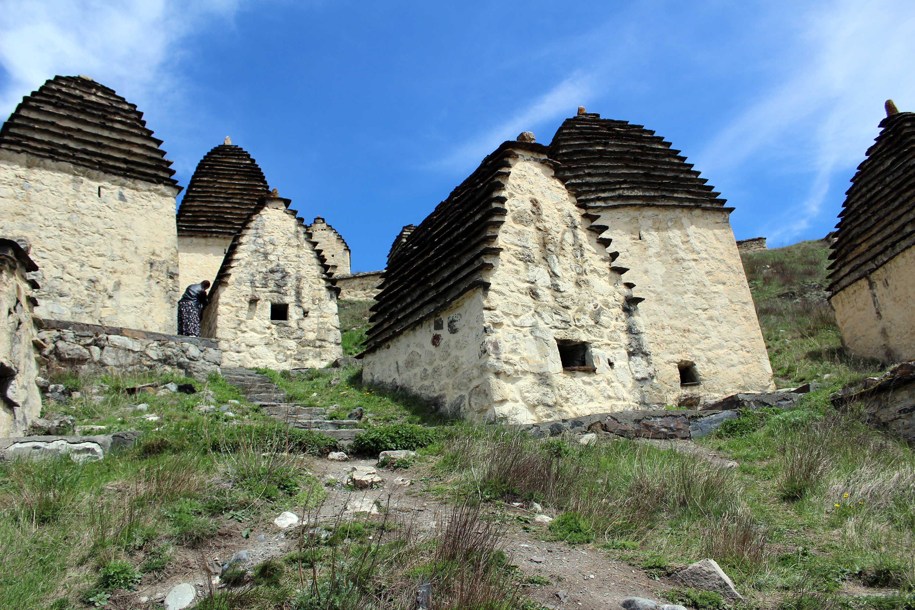Средневековый некрополь находится в Северной Осетии Алании, в селении Даргавс. Вообще вся эта горная республика, состоит из священных рощ, гор, святилищ. церквей. Я покажу и расскажу об одном из них. Это уникальное место уже почти семь столетий окутано ореолом тайн и легенд. "Город мертвых" расположен на сухой площадке, где не застаивается вода, а территория продувается со всех сторон, что в результате и обеспечило некрополю долгую жизнь, а спустя 700 лет он стал Меккой для археологов, ученых и туристов: все останки хорошо сохранились, позволив изучать историю древних народов. У некрополя много легенд о его появлении. Одна из них гласит, что в селение неизвестно откуда пришла девушка невиданной красоты. Все мужчины бросили свои семьи, оставили дела и начали биться друг с другом за право взять девушку в жены. И в дуэлях за красавицу погибло несколько человек.Чтобы разрешить спор, незнакомку отвели на совет старейшин. Но и у стариков, многим из которых давно перевалило за 70 лет, заблестели глаза при ее виде. Они начали спорить друг с другом, забыв приличия. В конце концов женщины селения решили остановить этот хаос: они потребовали изгнать незнакомку, объявив ее ведьмой.Но мужчины не хотели отдавать красавицу кому-либо и после долгих размышлений решили убить девушку, чтобы она была доступна только Богу. Однако после ее смерти на поселок обрушилась эпидемия чумы. Когда умерших начали закапывать в землю, она не принимала останки, а выбрасывала их на поверхность. Поэтому оставшиеся в живых начали строить склепы, где и хоронили усопших. На усыпальнице начертано обращение к потомкам: "С любовью смотрите на нас. Мы были такие, как вы, вы будете такие, как мы" - Каждая из усыпальниц состоит из нескольких ярусов и вмещает в себя до сотни захороненных останков, - рассказывает заведующий этнографическим комплексом "Город мертвых" Ислам Сасиев. - Таким образом, в некрополе покоится около 10 тысяч человек. Причем многие гробы выдолблены по фигуре и сделаны в форме лодки, хотя поблизости нет моря. Это связано с поверьем, будто после смерти умерший должен переплыть реку забвения, чтобы попасть в царство усопших.