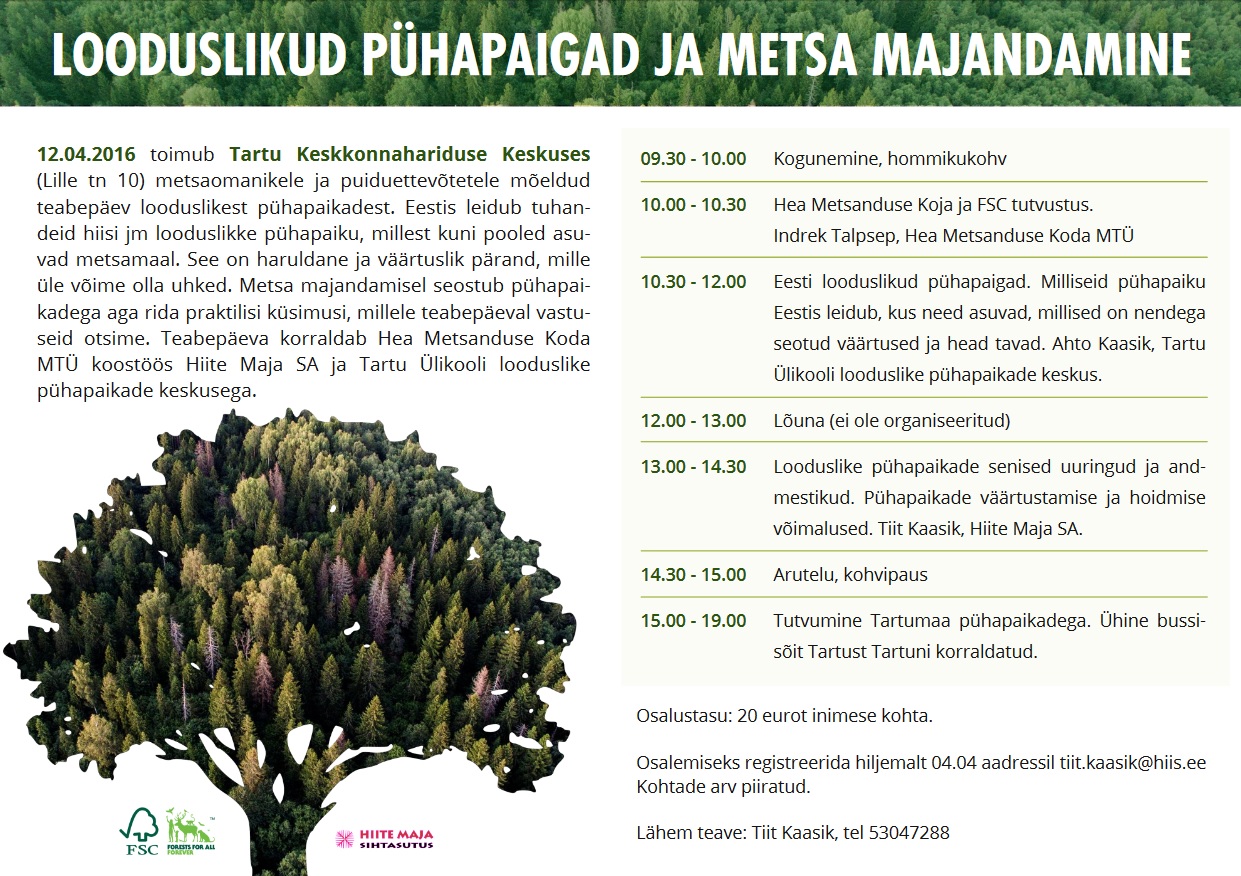 12.04. toimub Tartu Keskkonnahariduse keskuses (Lille tn 10) metsaomanikele ja puiduettevõtetele mõeldud teabepäev looduslikest pühapaikadest. Eestis leidub tuhandeid hiisi jm looduslikke pühapaiku, millest kuni pooled asuvad metsamaal. See on haruldane ja väärtuslik pärand, mille üle võime olla uhked. Metsa majandamisel seostub pühapaikadega aga rida praktilisi küsimusi, millele teabepäeval vastuseid otsime. Teabepäeva korraldab Hea Metsanduse Koda MTÜ koostöös Hiite Maja SA ja Tartu Ülikooli looduslike pühapaikade keskusega.